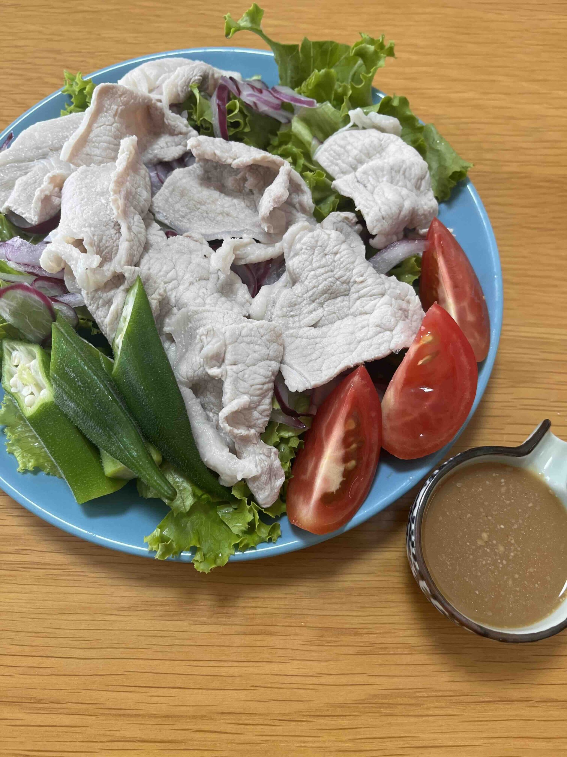 〈材料〉 一人分 豚ロース薄切り 100g 赤玉ねぎ 80g グリーンレタス 50g オクラ 25g トマト 40g…